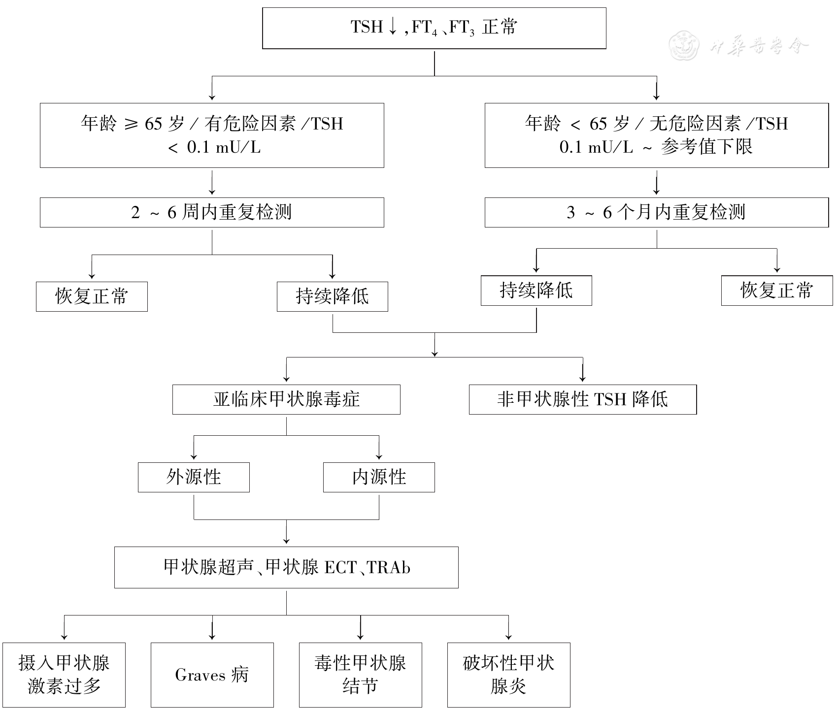 首先根据病史、临床表现,结合FT4、FT3和TSH水平确定是否存在甲状腺毒症[1,15,29,42],之后进一步明确甲状腺毒症的病因。