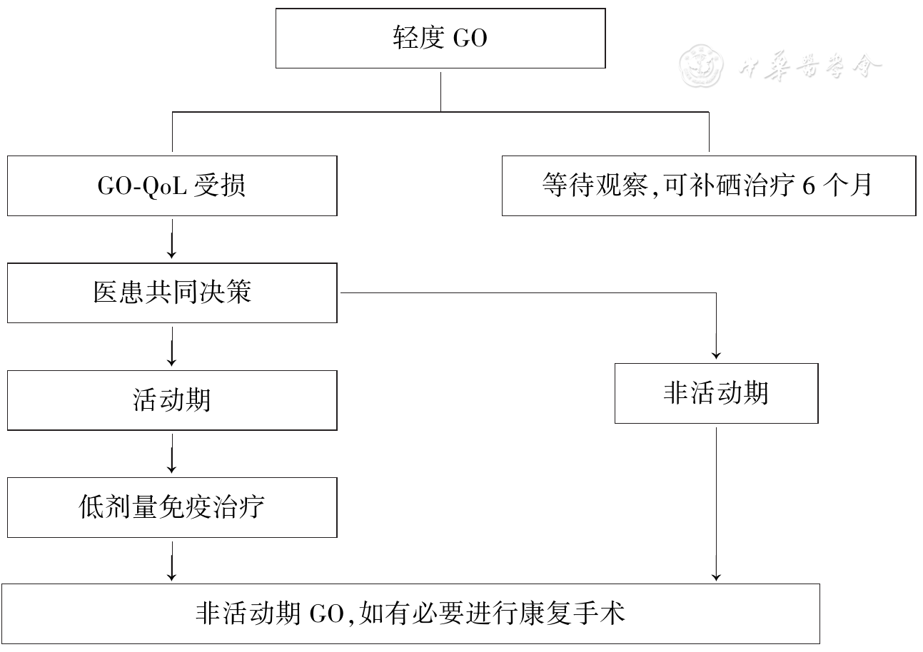 建议131I治疗1~3个月后复查,如病情较重时,应根据需要密切随诊。之后每隔1~2个月监测甲状腺功能,并持续至半年,或直至患者发生甲减行甲状腺激素替代治疗后达到稳定状态。存在GO者,可适当增加随访频率,避免早发甲减致GO加重。如确定已完全缓解,随访间隔时间可延长,建议至少每年随诊1次。