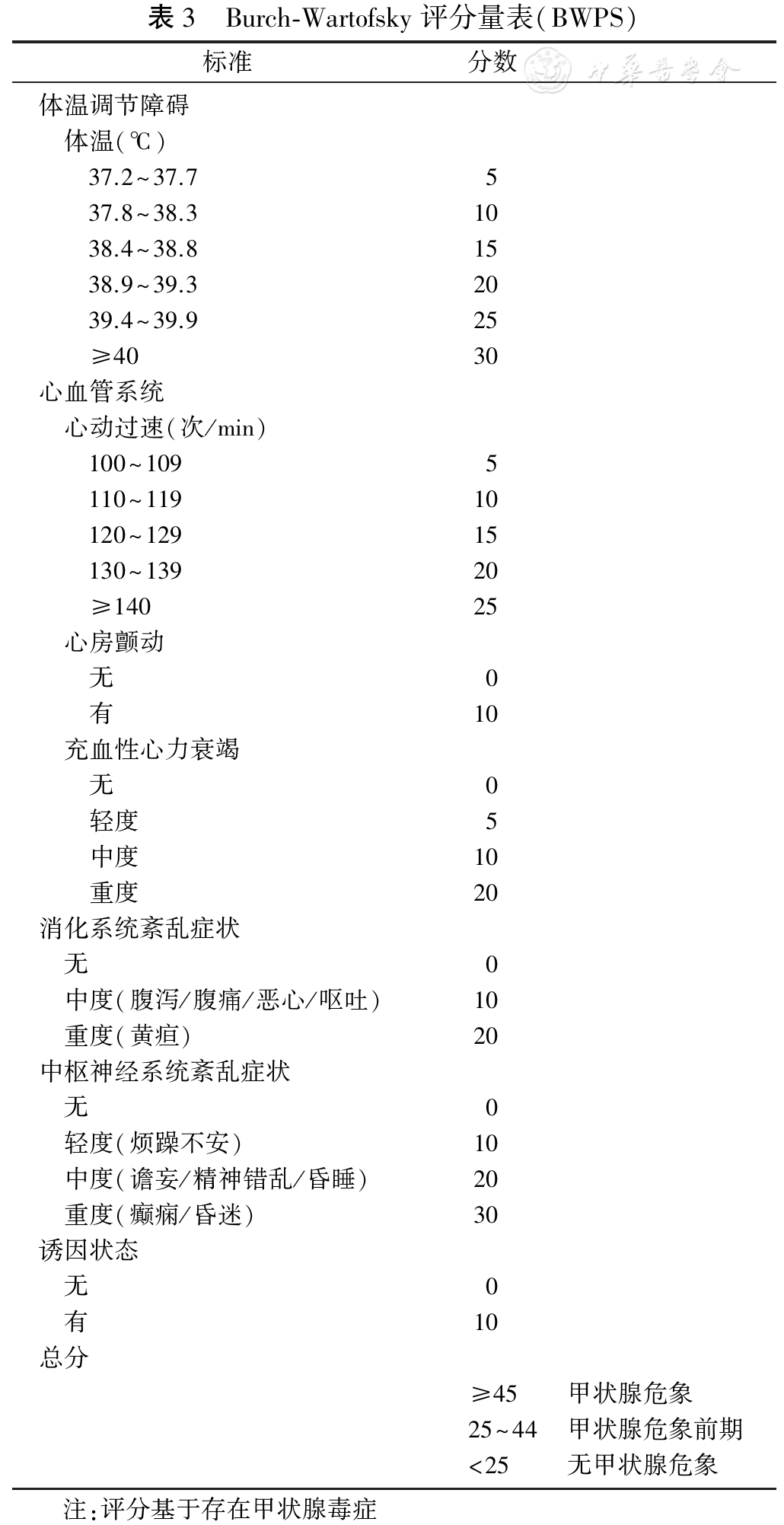 1993年提出的Burch-Wartofsky评分量表(BWPS)目前被广泛应用于甲状腺危象的诊断(