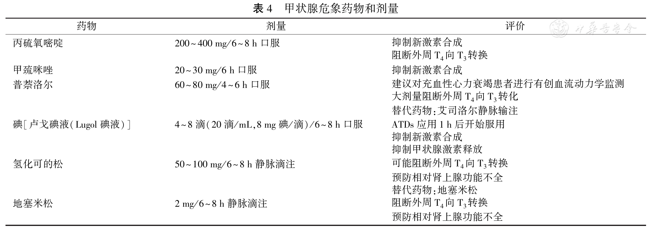 甲状腺危象病死率高,应早期识别,积极综合治疗。治疗目标是降低甲状腺激素分泌和合成、减少甲状腺激素的外周效应、改善全身失代偿症状、去除诱因及治疗并发疾病[66]。治疗甲状腺危象的药物剂量和用法见