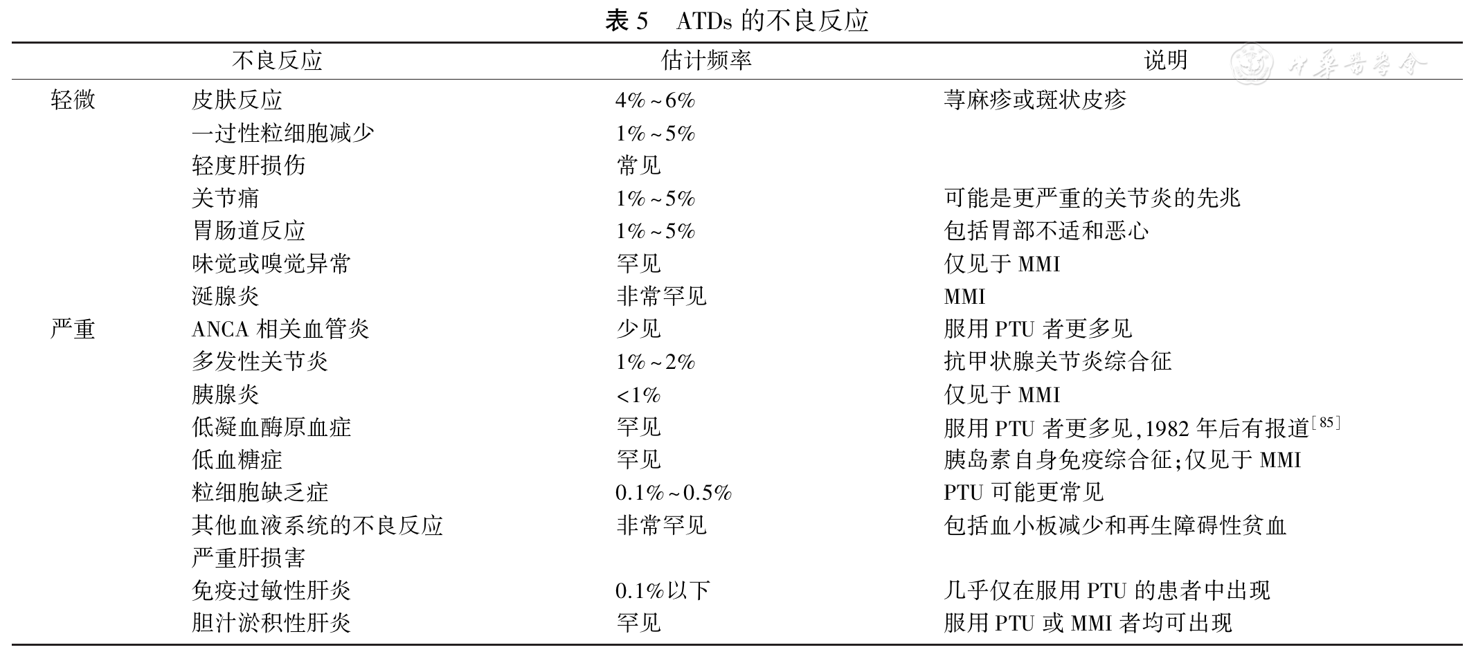 出现ATDs导致的轻微不良反应时,换用另一种ATDs治疗是安全的。有研究报道,34%换为PTU的患者及30%换为MMI的患者仍然出现了ATDs的不良反应,该不良反应常常与第一种ATDs导致的不良反应类型相同,而其余患者则可耐受第二种ATDs[85]。