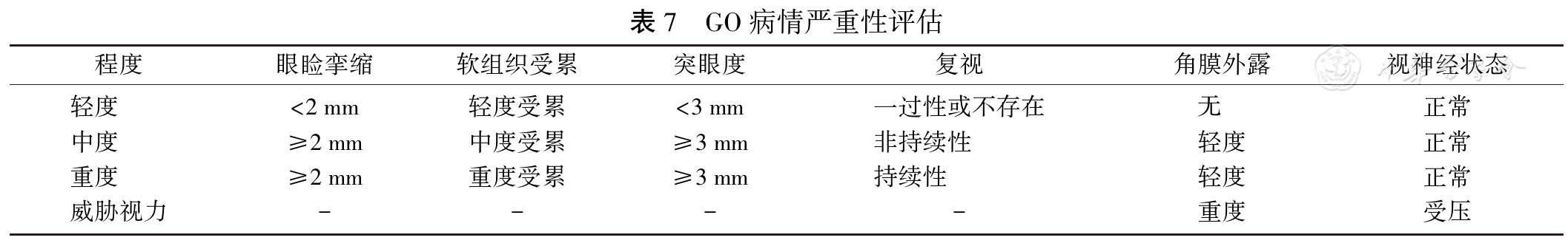 Graves眼病(Graves′ ophthalmopathy, GO):是GD甲状腺外的重要表现,可出现眼内异物感、胀痛、畏光、流泪、复视、斜视、视力下降。查体可见眼球突出,眼睑退缩、肿胀,结膜充血、水肿,甚至眼球活动受限、眼睑闭合不全,甚至因角膜外露而形成角膜溃疡、全眼炎,还可出现甲状腺相关眼病视神经病变(DON),严重者导致失明。