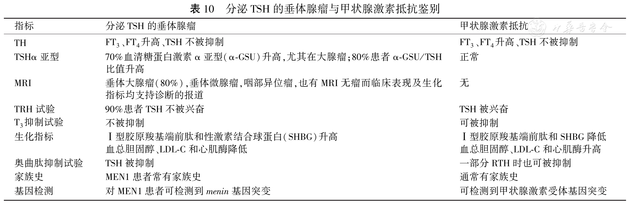 奥曲肽抑制试验主要用于鉴别分泌TSH的垂体腺瘤和RTH所致甲状腺毒症,奥曲肽可显著降低大多数分泌TSH的垂体腺瘤患者血TSH水平,诊断分泌TSH的垂体腺瘤的敏感度和特异度分别为95.00%和93.75%,阳性率为88.89%,即使对于部分微腺瘤患者,垂体影像学未出现阳性结果,奥曲肽抑制试验阳性也提示分泌TSH的垂体腺瘤[59]。目前国外指南对上述三个功能试验在甲状腺毒症鉴别诊断中的临床应用均缺乏推荐。