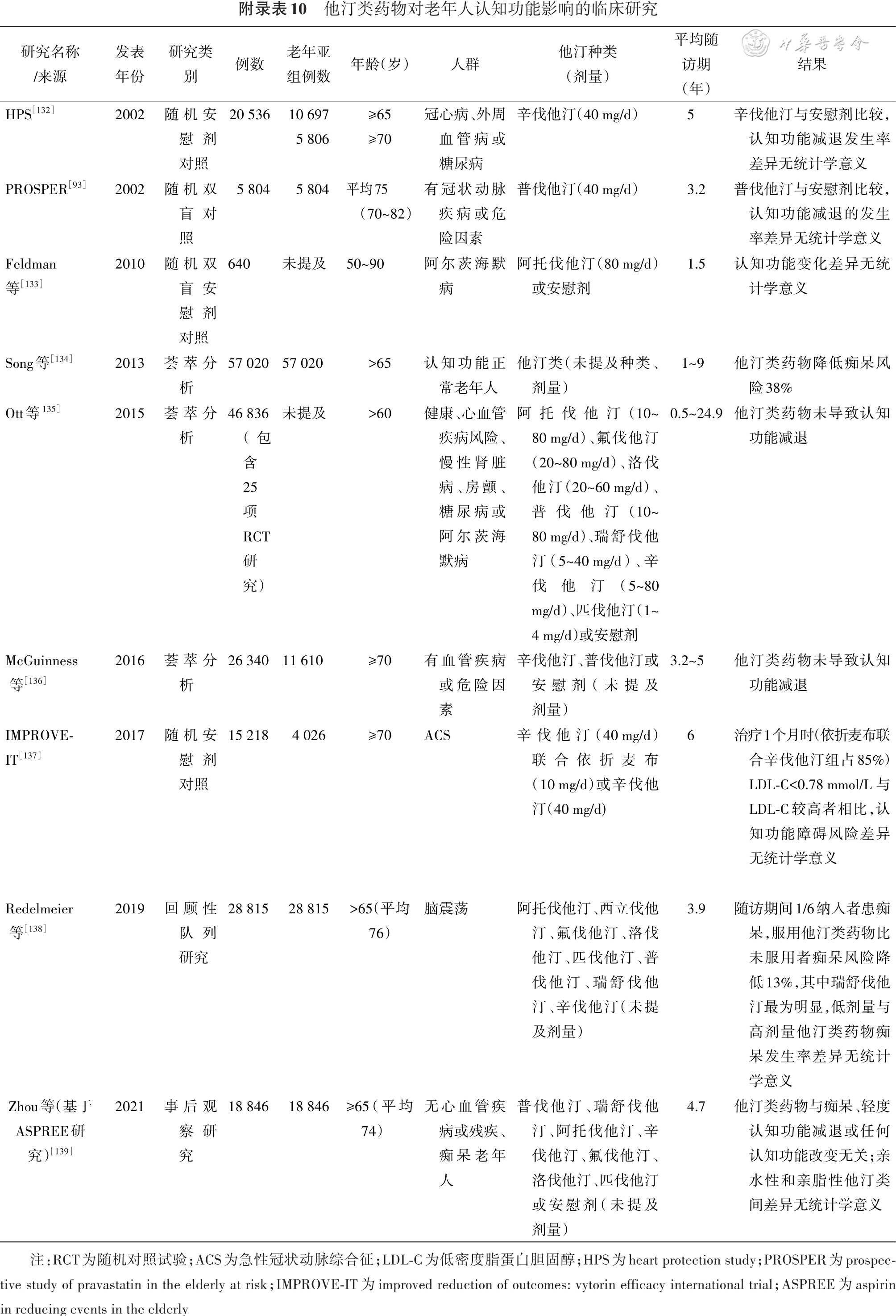 [139] Zhou Z, Ryan J, Ernst ME, et al. Effect of statin therapy on cognitive decline and incident dementia in older adults[J]. J Am Coll Cardiol, 2021, 77(25): 3145-3156. DOI: 10.1016/j.jacc.2021.04.075.