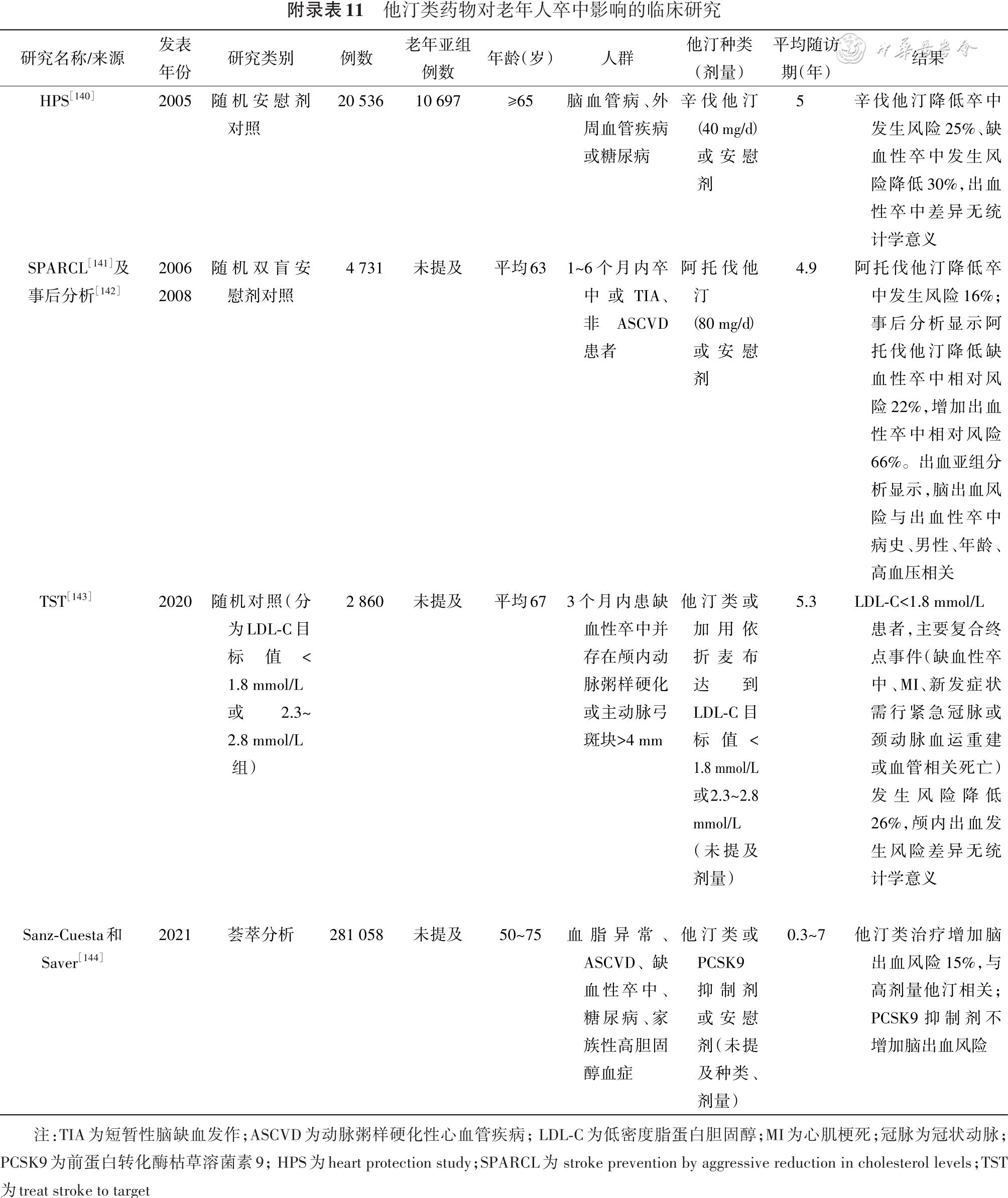 [144] Sanz-Cuesta BE, Saver JL. Lipid-lowering therapy and hemorrhagic stroke risk: comparative meta-analysis of statins and PCSK9 inhibitors[J]. Stroke. 2021, 52(10):3142-3150. DOI: 10.1161/STROKEAHA.121.034576.