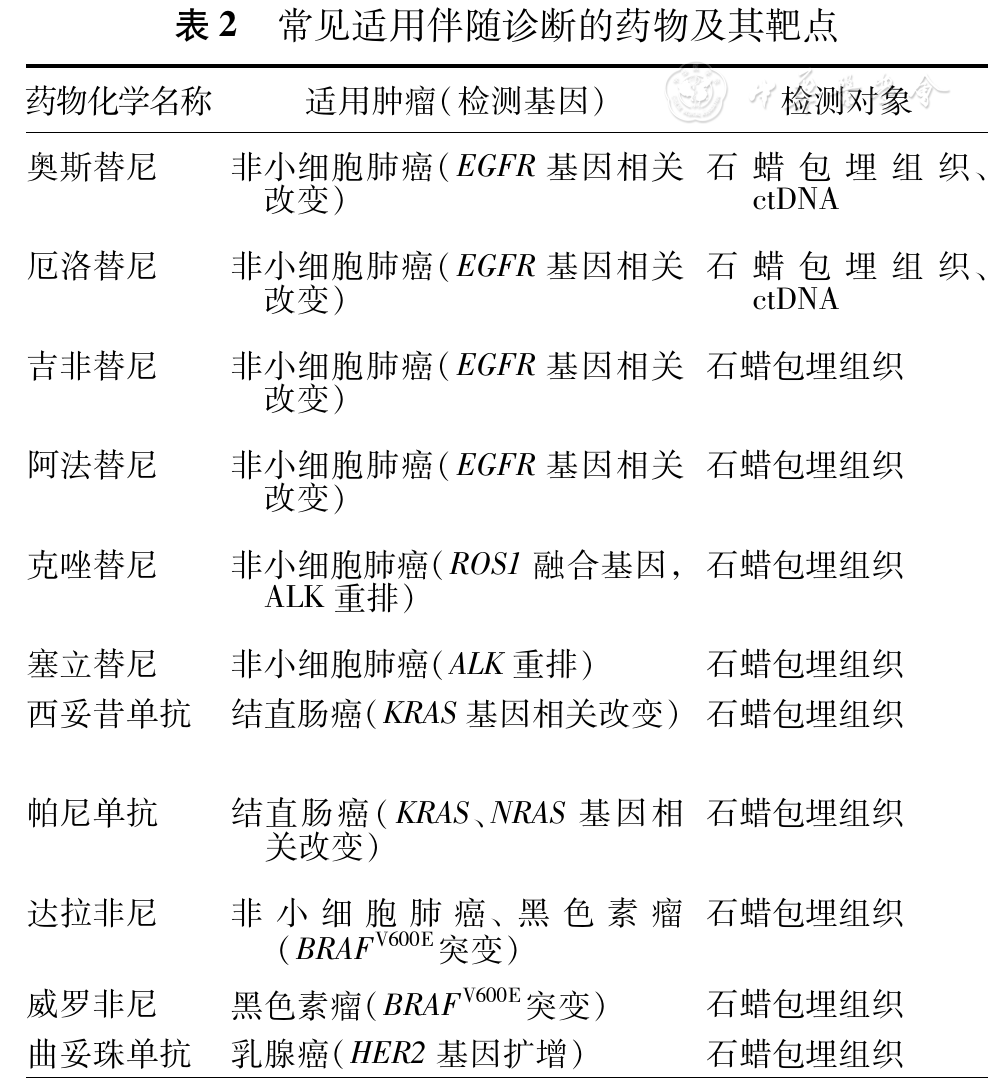 靶向药物使用过程中实行伴随诊断有助于确保药物安全性与有效性,是执行"精准医疗"理念的核心步骤之一。因此,伴随诊断在临床肿瘤综合管理中的价值愈发显著。截至2018年4月,已有多种靶向药物伴随诊断系统被FDA批准用于实际临床工作,常见适用伴随诊断的药物及其靶点如表2所示。