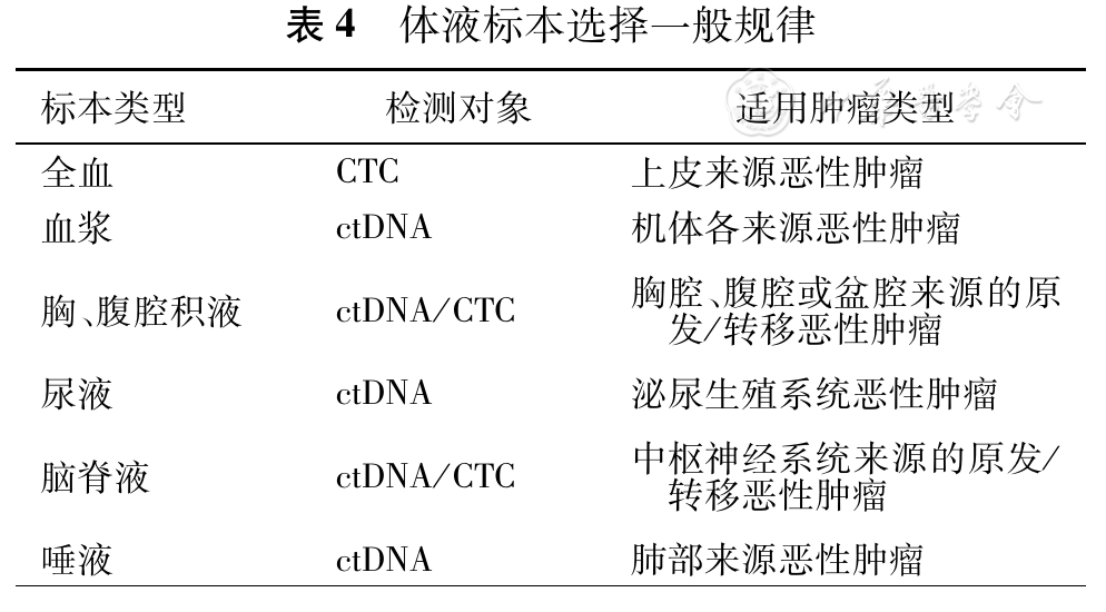 在临床实践过程中,应综合考虑到患者病灶累及部位、转移情况的复杂性、不同体液标本的特征,优先选择液体活检靶标最易检出部位标本(例如广泛腹腔/盆腔转移患者可优选腹水;中枢转移性肿瘤可优选脑脊液);针对难以判断的患者,建议联合多种体液标本的检测结果,为临床勾勒肿瘤演化的全貌,提供多维的肿瘤患者诊疗的图谱。体液标本选择一般规律如表4所示: