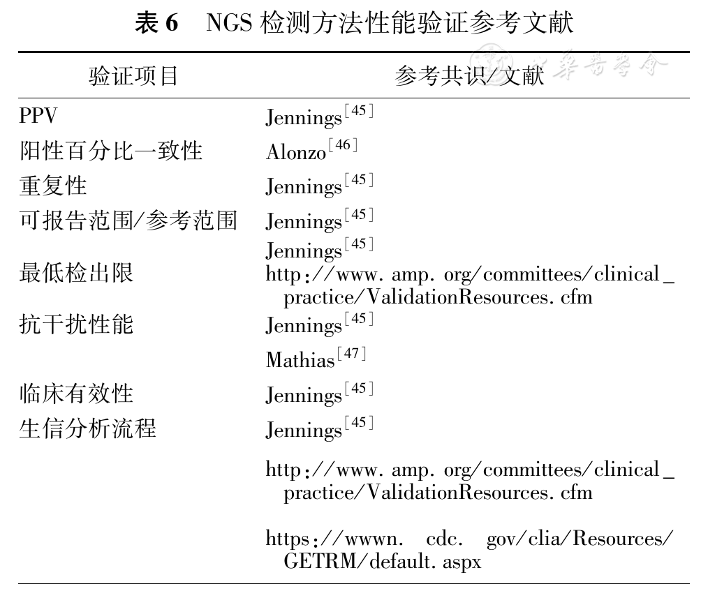 NGS方法性能确认须包含阳性预期值(Positive Predictive Value, PPV)、阳性百分比一致性、重复性、可报告范围/参考范围、最低检出限、抗干扰性能、临床有效性、及生信分析流程确认。确认具体内容应遵循CAP相关共识文献指示,具体参考如表6所示。