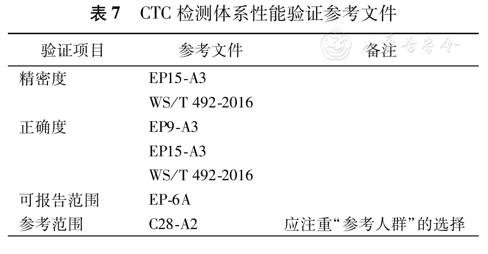CTC检测体系应依据相应EP文件对其精密度、正确度、可报告范围、参考范围进行性能验证,具体参考如表7所示。