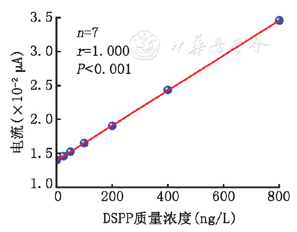 (1)电化学ELISA检测患者龈沟液中DSPP含量:与传统ELISA类似,首先建立电化学ELISA质量浓度-电流信号标准工作曲线,在该浓度范围内,样品反应电流与质量浓度间呈线性关系。基于同样体系测试患者龈沟液样品反应信号强度,并依据线性范围工作曲线读取患者样品中DSPP质量浓度。具体方法:先将标准人DSPP在小试管中倍比稀释,向预先包被了DSPP单克隆抗体的酶标孔中加入质量浓度分别为0、25、50、100、200、400、800 ng/L的DSPP标准品和生物素标志的抗DSPP抗体混合溶液50 μl,链霉亲和素标志的HRP溶液50 μl,37 ℃下温育60 min后用含0.05% Tween-20的0.02%PBS洗涤5次,去除未结合的标志酶,再向酶标板中加入底物溶液200 μl(底物溶液配制方法:于10 ml比色管中依次加入4.0×10-3 mol/L TMB溶液0.2 ml, 1.0×10-2 mol/L H2O2溶液1.0 ml, 0.2 mol/L pH为6.0的磷酸-醋酸-硼酸缓冲溶液5.0 ml,稀释至刻度并混合均匀),在37 ℃反应30 min进行酶催化反应,反应后向每个酶标孔中加入50 μl 0.2 mol/L pH 5.0磷酸-醋酸-硼酸缓冲液作为终止液,将JP-303极谱分析仪(成都仪器厂)的微型三电极系统直接插入酶标孔中检测产物,在一定浓度范围内检测电流信号强度与DSPP质量浓度呈线性关系,绘制DSPP电化学ELISA的线性回归方程,获得并建立DSPP电化学ELISA标准工作曲线,由此可测定患者龈沟液样品中DSPP准确含量。以上过程以HRP为标志酶,TMB作为反应底物,该底物被H2O2氧化形成具有电活性的产物。在最佳反应条件下,TMB-H2O2-HRP系统与ELISA反应结合,进而用于龈沟液中DSPP的检测。