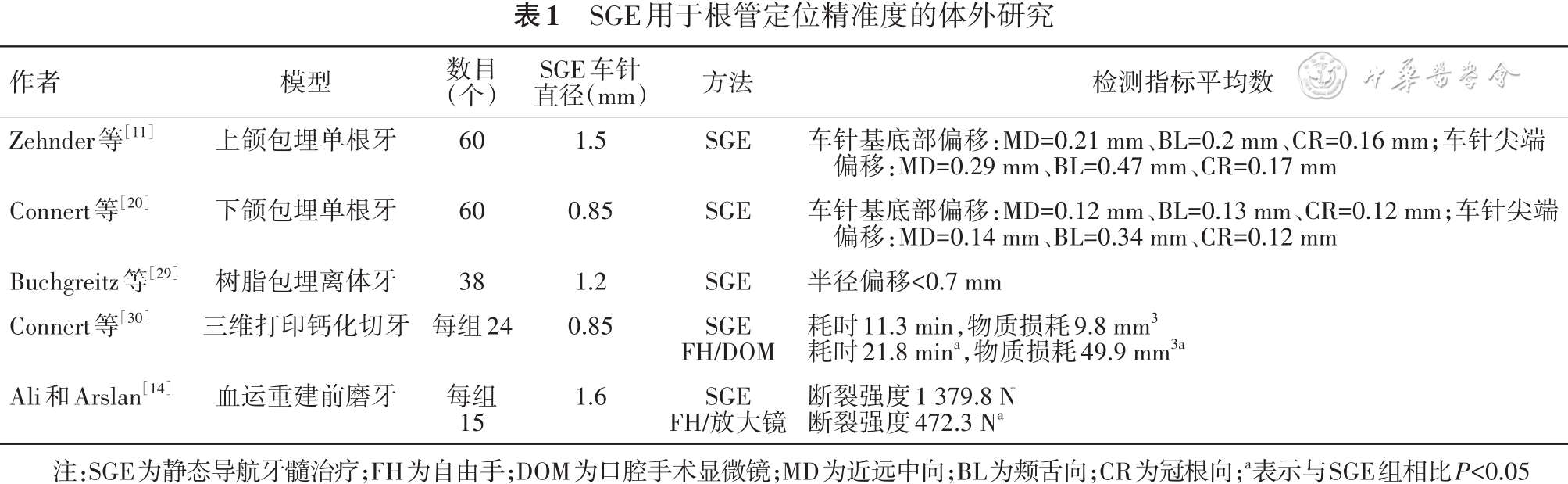 SGE操作过程中,由于导板遮挡且碎屑易堆积在套管和车针之间,术者无法直视术区,一旦偏移不能调整,因此准确度是决定SGE临床应用前景的关键。体外研究认为SGE引导开髓准确性较高,相比DOM下自由手操作具有一定优势(表1)[11,14,20,29, 30],但目前尚缺乏大规模高质量的临床研究。Buchgreitz等[31]报道50例单根钙化牙开髓均有良好的精准度,即使偏移最大时其开髓通路在临床仍可接受。下颌牙比上颌牙准确度更佳,可能与下颌牙根管钙化长度较短有关;曾做根管疏通的患牙与未处理患牙相比准确度更高,可能与车针受阻力较小有关。另外,虽然钙化根管有时在影像学上不显示,但其在单根牙居中的位置结合锥形束CT的三维校准不会引起设计通路过度偏离,所以未导致开髓失误。